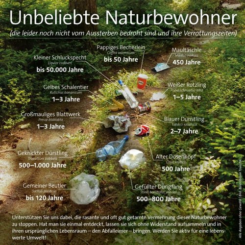 Ausrüstung: Festes Schuhwerk ist zu empfehlen, die Müllsäcke und Handschuhe werden am Treffpunkt ausgeteilt. Die Einsatzorte werden am Treffpunkt aufgeteilt.